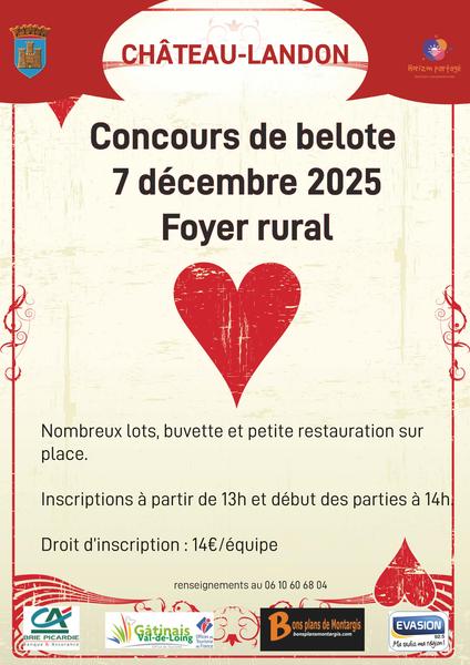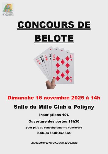 Venez participer à notre concours de belote organisé par notre Association Fêtes et Loisirs de Poligny. Ambiance conviviale, lots à gagner, buvette et petite restauration sur place.