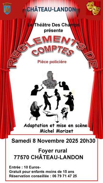 Le Théâtre Des Champs a le plaisir de vous présenter sa nouvelle pièce policière : "Règlements de Comptes" ! Une comédie savoureuse où les rancunes conjugales mènent à un pacte aussi fou que drôle, adaptée et mise en scène par Michel Morizet !