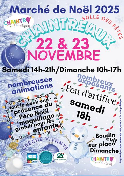 Marché de Noël à Chaintreaux, ça sent les fêtes qui arrivent ! Une quarantaine d'exposants seront présents. De nombreuses animations vous seront proposées tout le week-end dont un feu d'artifice samedi 18h30.