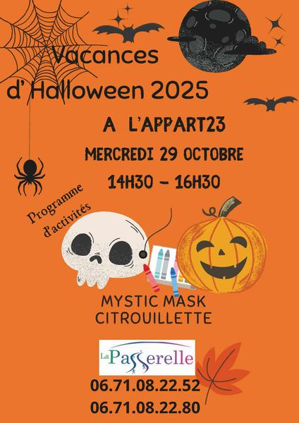 Préparez-vous pour les vacances d'Halloween 2025 à L'APPART23 avec un programme d'activités incluant Mystic Mask et Citrouillette ! Inscription : 06 71 08 22 52 ou 06 71 08 22 80