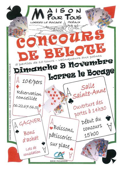 Concours de belote à la Salle Sainte Anne à Lorrez-le-Bocage. Lots : bons d'achat et de consolation.