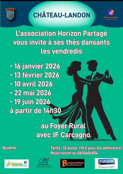 Venez nombreux partager un agréable moment de convivialité et de danse ! L'association Horizon Partagé vous invite à son 1er thé dansant animé par le talentueux JF Carcagno au foyer rural à Château-Landon.