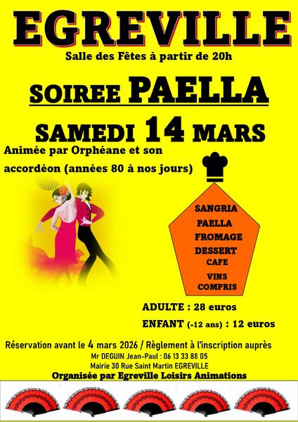 Venez passer un bon moment en famille ou entre amis à notre soirée Paëlla animée par Orphéane et son accordéon. On vous attend nombreux.