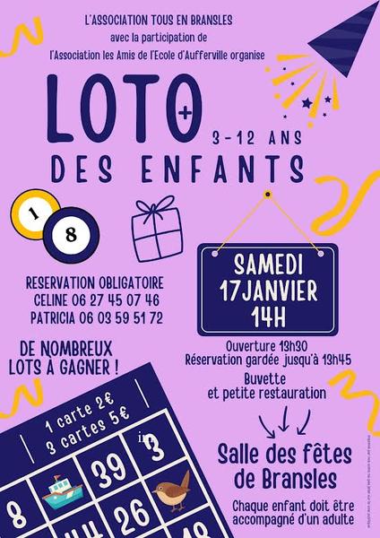 LOTO POUR ENFANTS 3 à 12 ans, chaque enfant doit être accompagné d'un adulte. Le loto est aussi ouvert aux enfants hors communes. Réservation obligatoire