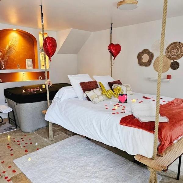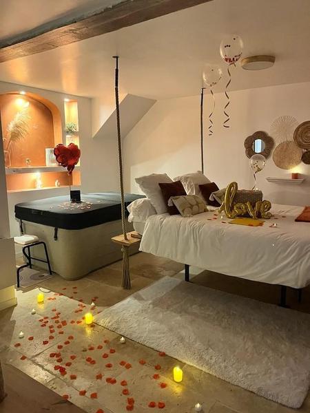 Située au rez de chaussée (accès 2 marches) et d'une superficie de 30m², la chambre est équipée d'un lit double suspendu en 160x200, d'un SPA pour 2 personnes, d'un espace cuisine et d'une salle d'eau avec douche à l'Italienne et WC. Elle possède une petite terrasse avec mobilier de jardin.