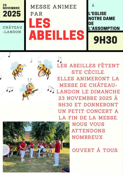 Rendez-vous à l’Église Notre Dame de l'Assomption à Château-Landon pour fêter ensemble la Sainte Cécile. La messe sera suivie à 9h30 suivi d'un petit concert avec les Abeilles de Château-Landon.