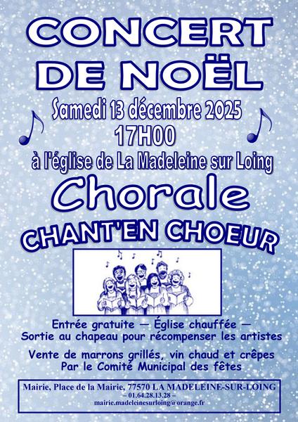 Concert de Noël par la chorale "Chant'en Coeur de Château-Landon à l'église de la Madeleine-sur-Loing. A la fin du concert, vente de vin chaud, marrons grillés et crêpes par le Comité des fêtes.