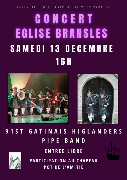 RESTAURATION DU PATRIMOINE PROPOSE UN CONCERT EN L EGLISE SAINT LOUP DE BRANSLES GROUPE 91ST GATINAIS HIGHLANDS PIPEBAND