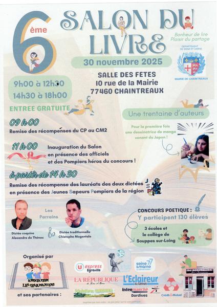 6ème Salon du livre avec concours poétique à Chaintreaux au Sud de la Seine-et-Marne. Une trentaine d'auteurs venus de toute la France seront présents.